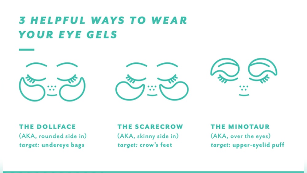 Eye masks sit under your eyes with the wider end facing inward for dark circles or outward for crow’s feet. Adjust for comfort.